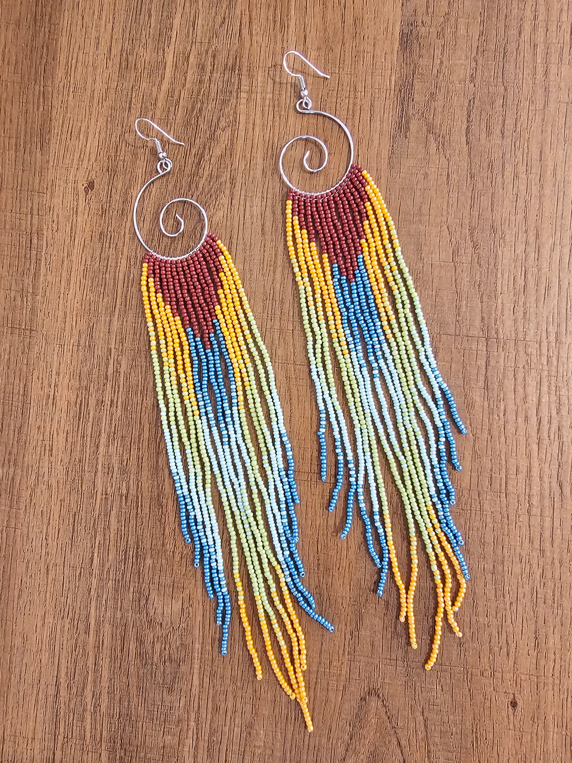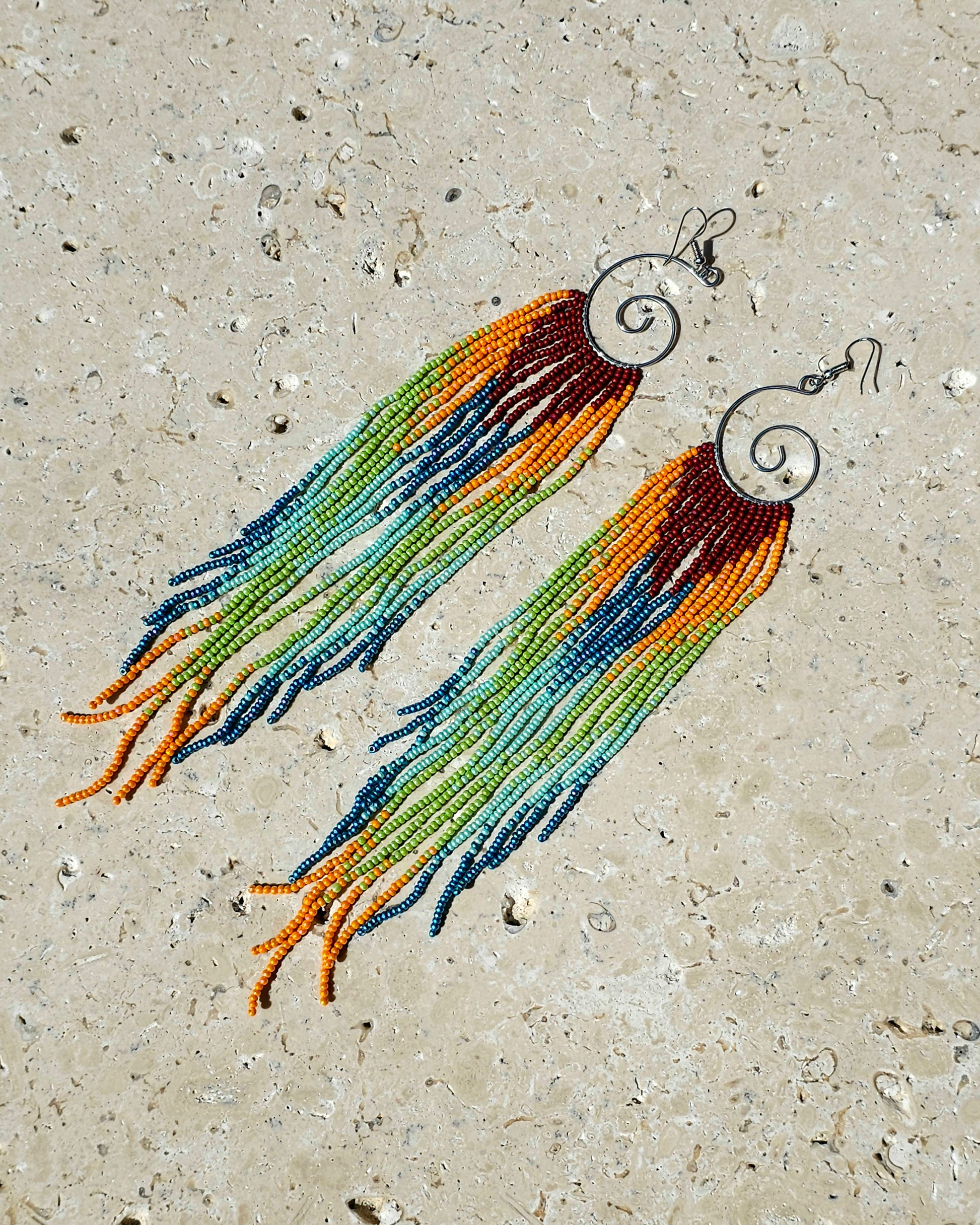 These stunning earrings flow with vibrant energy. Handwoven with delicate glass beads in earthy amber, lush green, and deep ocean blue, they sway gracefully from an elegant spiral, symbolizing movement and harmony. Lightweight and full of life, they’re perfect for the free-spirited soul who loves to shine with every step.