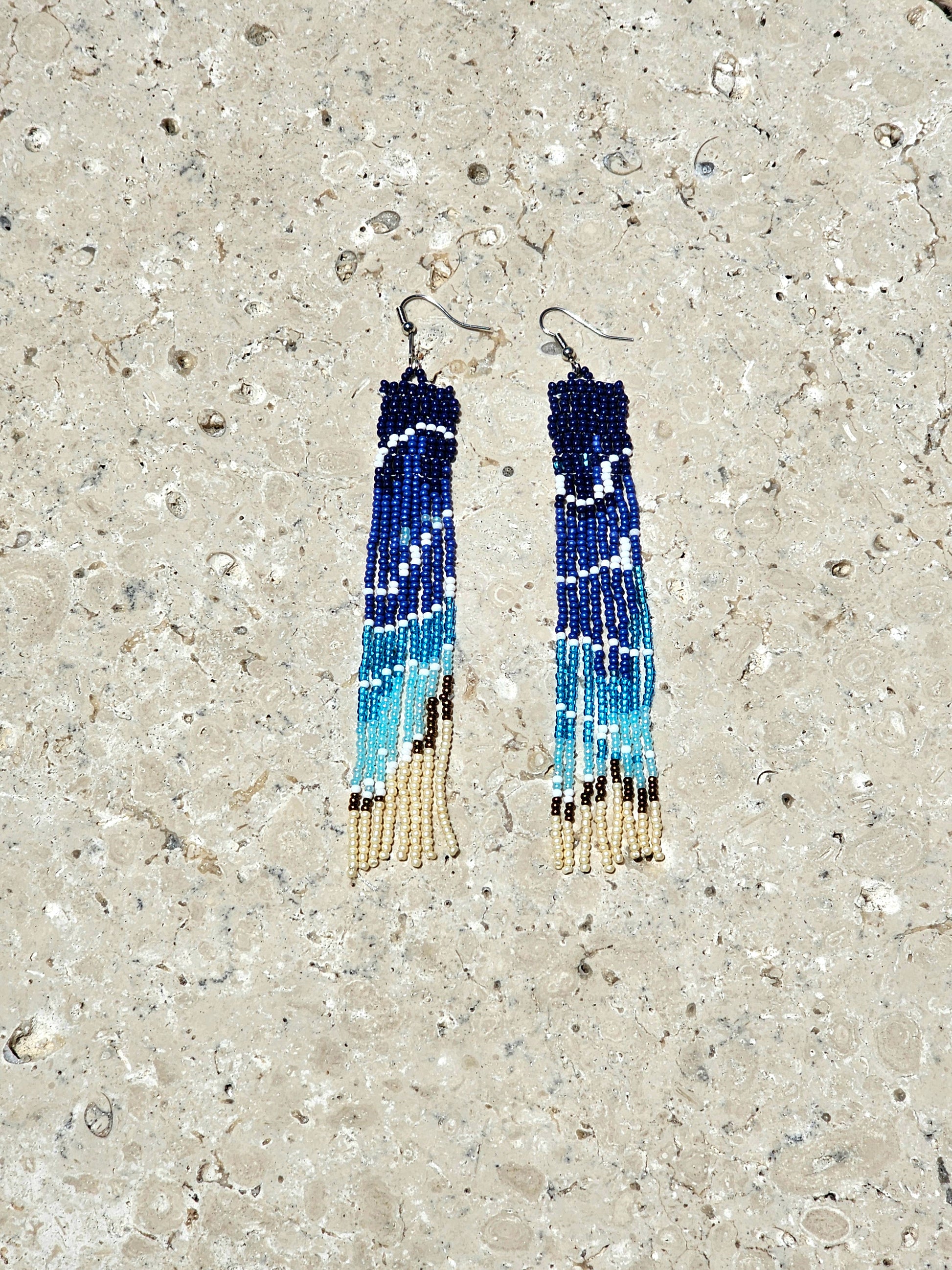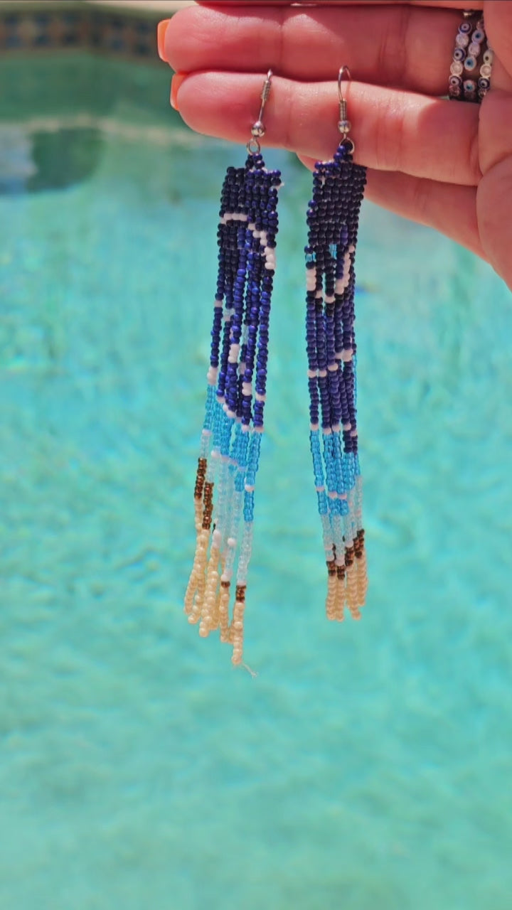 Delicate and fluid, these hand-beaded earrings flow like a waterfall in shades of deep ocean and sky. A serene touch of nature for your everyday look.