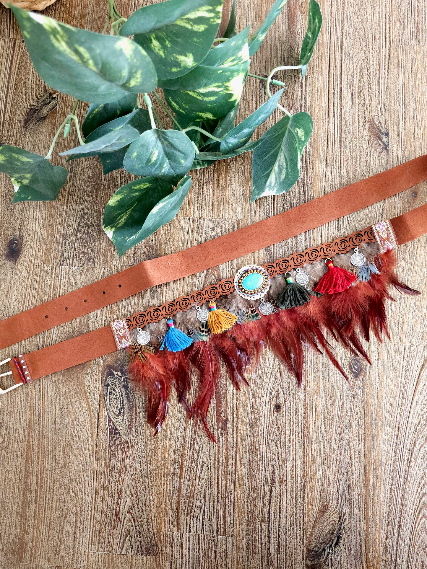 Adding to its eclectic charm, the belt is further embellished with a row of soft, reddish-brown feathers that create a dynamic and textured look. A turquoise and silver medallion sits prominently in the center, enhancing the belt's artistic and ethnic appeal.