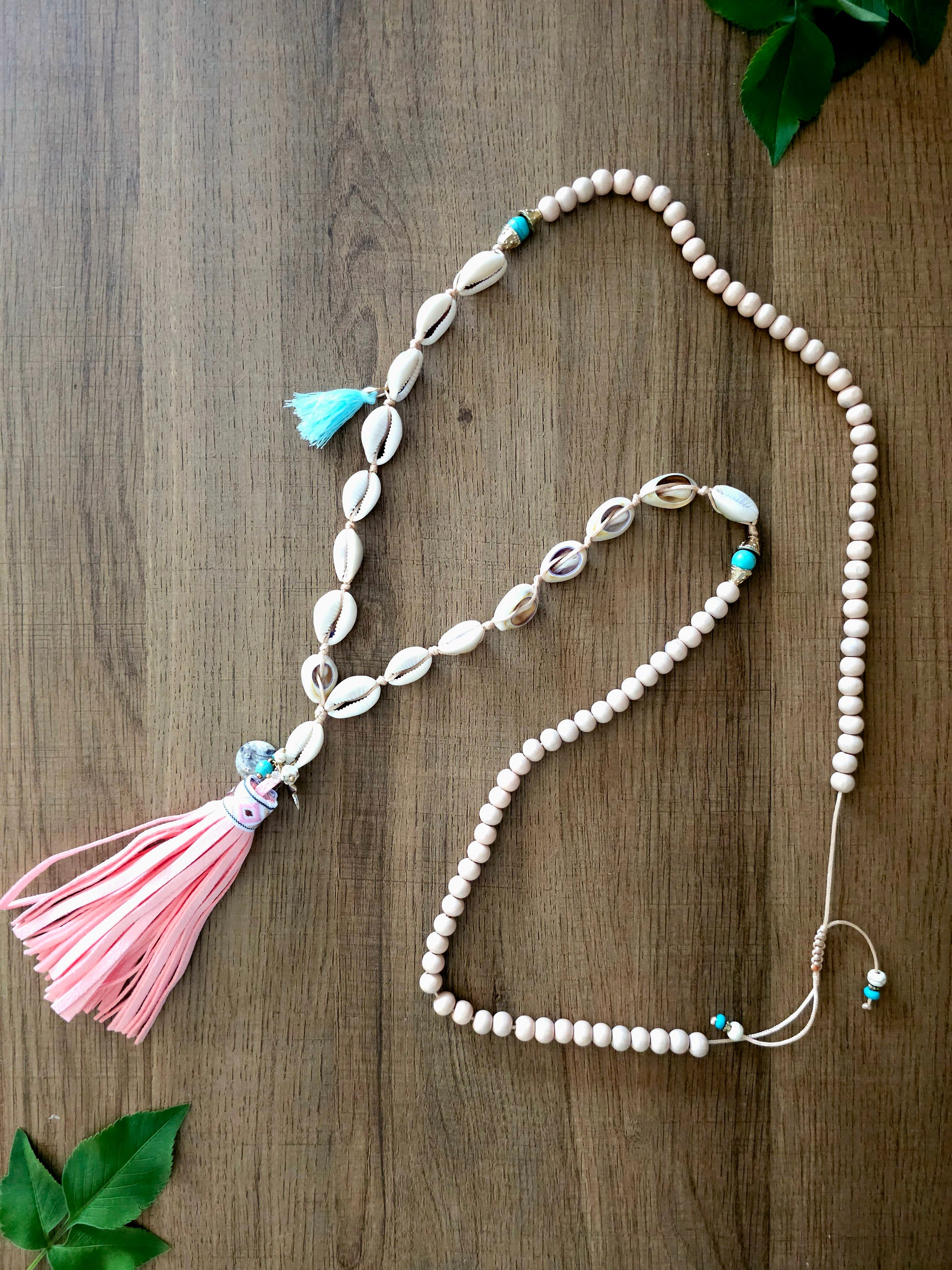 The Coastal Dream Necklace features delicate shells and smooth wooden beads, creating a natural boho aesthetic. Adorned with soft pastel tassels and intricate beadwork, this charm necklace captures a relaxed, beachy vibe that complements any outfit.