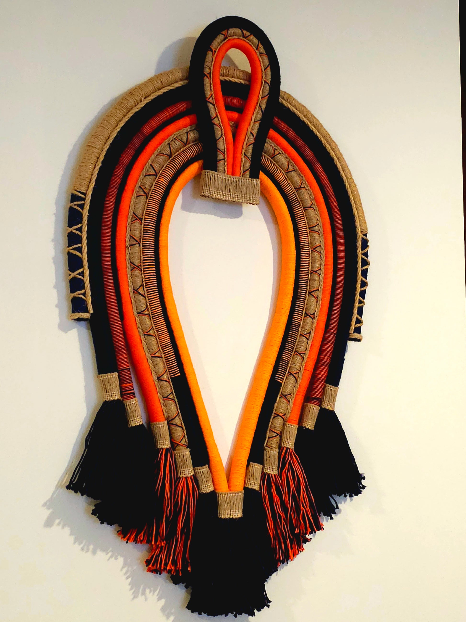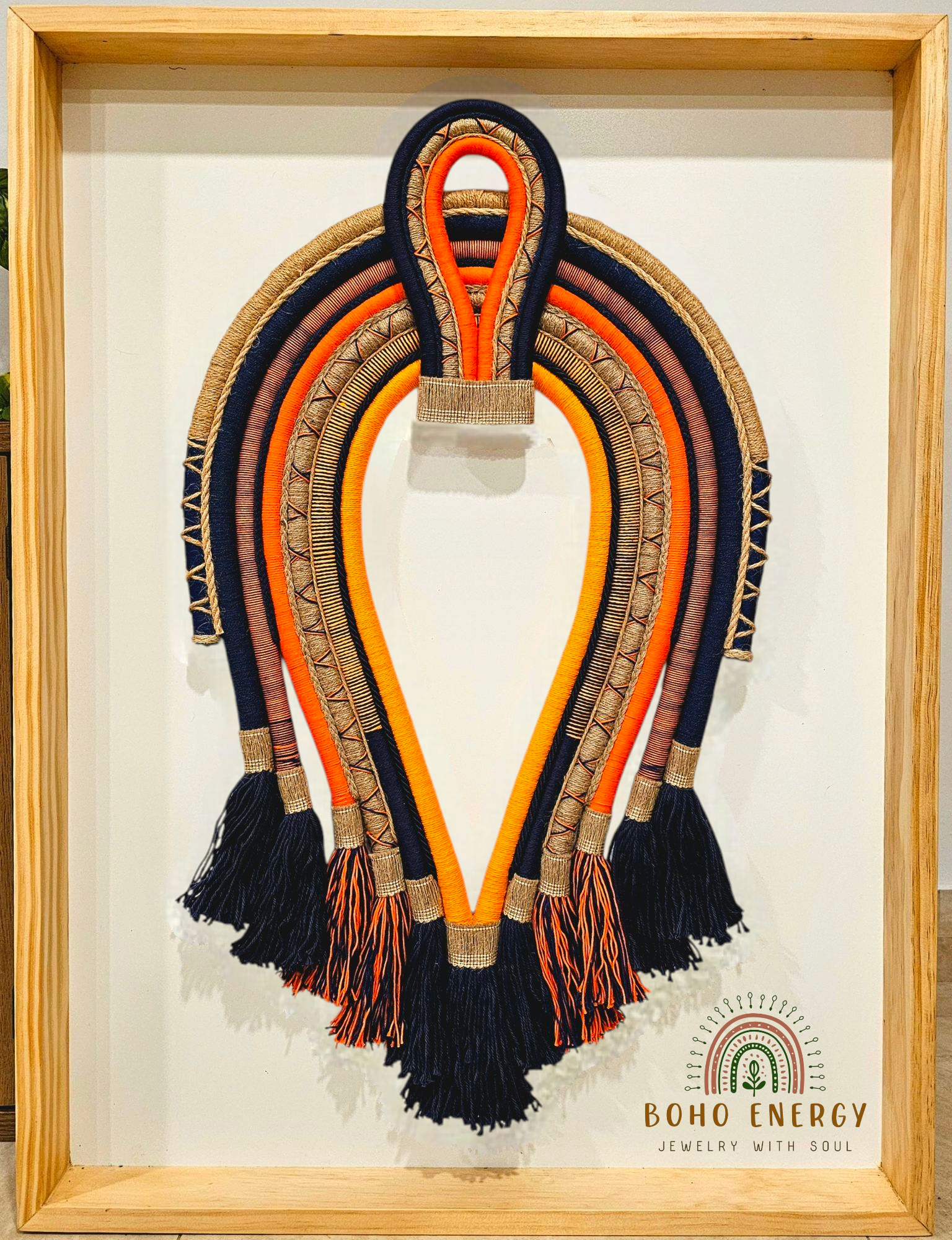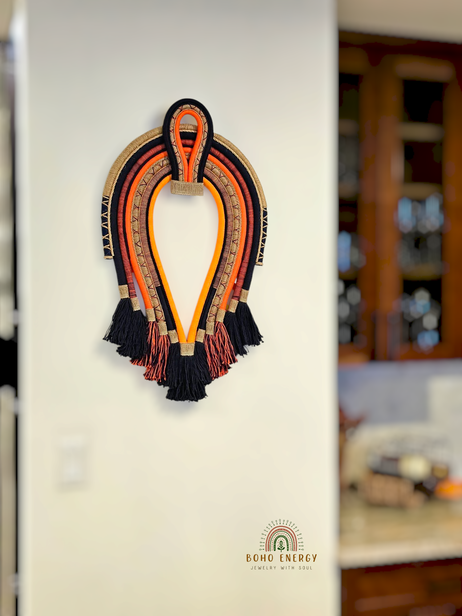 A Textile Cocar is a decorative wall hanging inspired by indigenous headdresses, crafted from woven fibers, fabric, and natural materials. It often features layered arches, intricate patterns, and a mix of textures like raffia, cotton, and wool. With earthy and vibrant hues, it mimics the grandeur of ceremonial feathered headdresses, with bohemian and modern aesthetics.