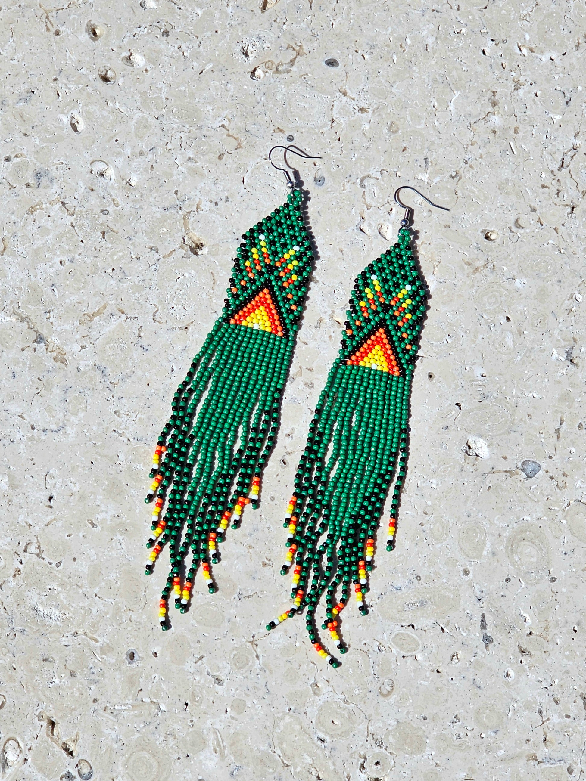 Bold and full of rhythm, these handmade earrings burst with the vibrant energy of the forest and fire. Featuring intricate green beadwork with tribal-inspired accents in red, yellow, and orange, they sway like dancing flames — a fierce, free-spirited statement for any look.