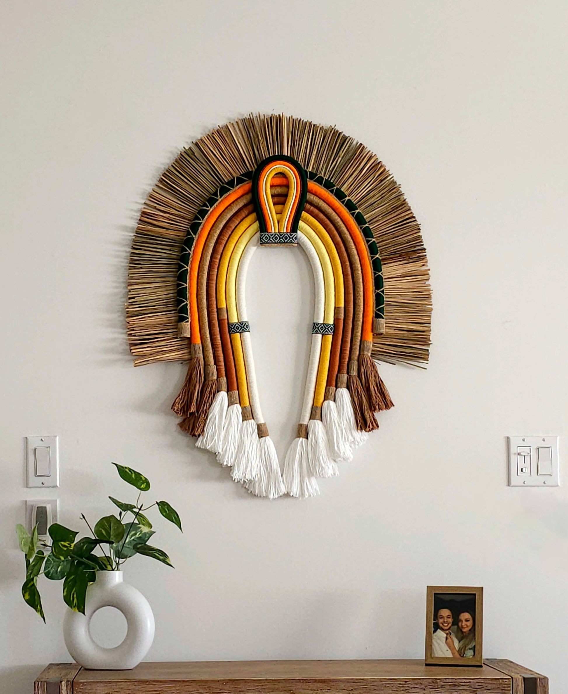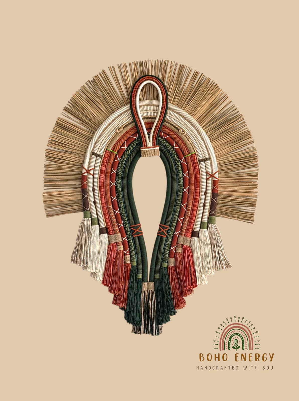 A Textile Cocar is a decorative wall hanging inspired by indigenous headdresses, crafted from woven fibers, fabric, and natural materials. It often features layered arches, intricate patterns, and a mix of textures like raffia, cotton, and wool. With earthy and vibrant hues, it mimics the grandeur of ceremonial feathered headdresses, with bohemian and modern aesthetics.