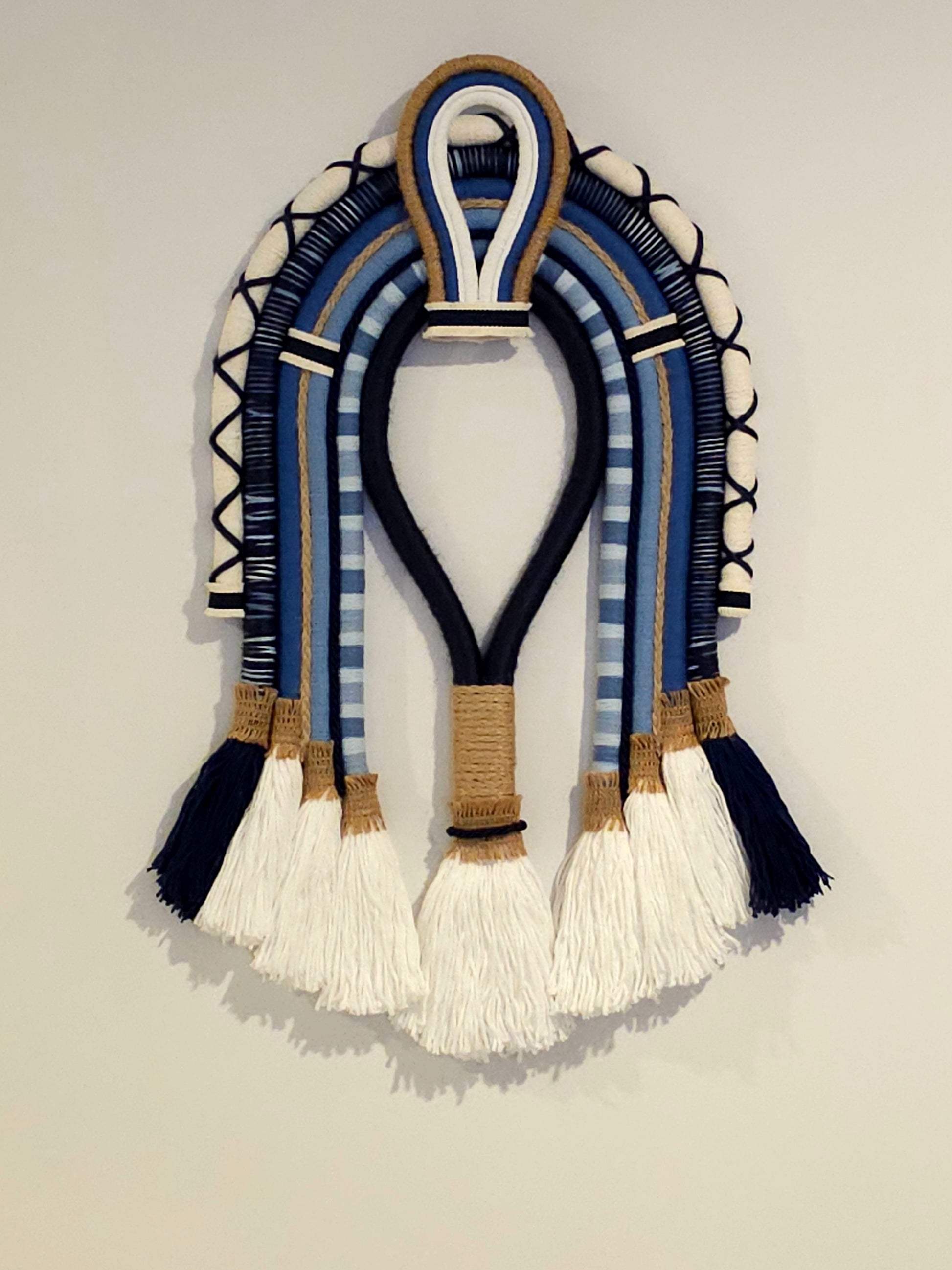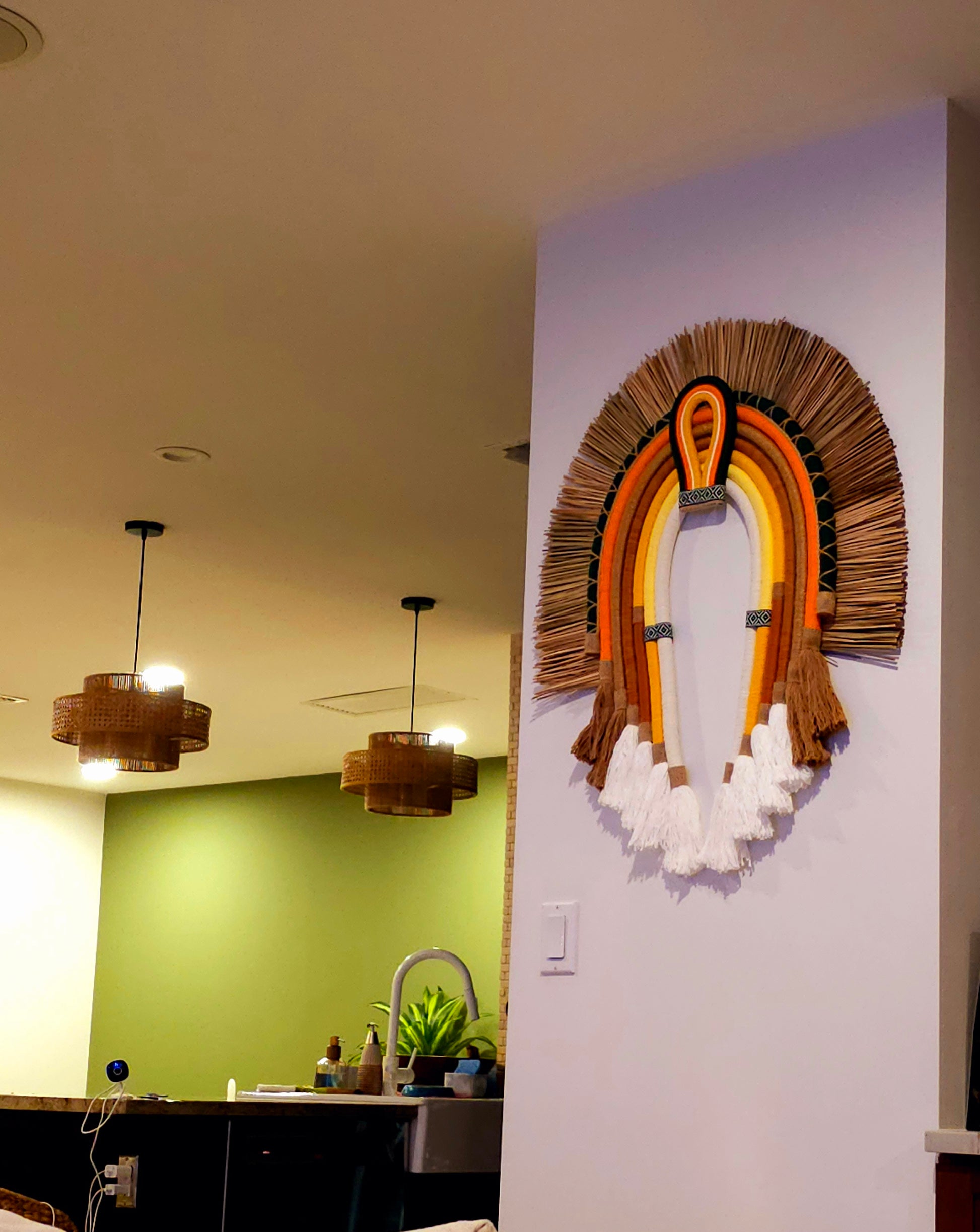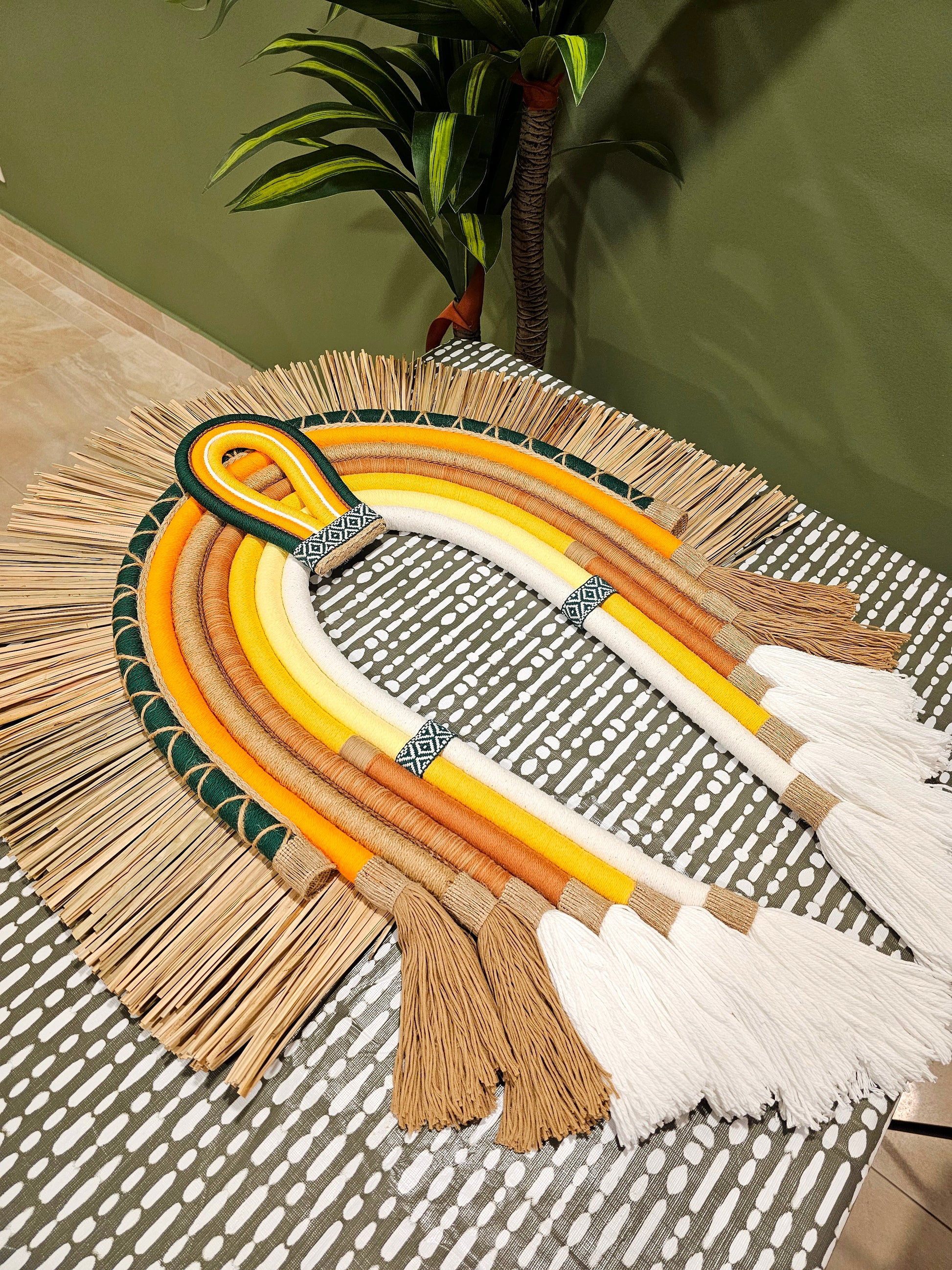 A Textile Cocar is a decorative wall hanging inspired by indigenous headdresses, crafted from woven fibers, fabric, and natural materials. It often features layered arches, intricate patterns, and a mix of textures like raffia, cotton, and wool. With earthy and vibrant hues, it mimics the grandeur of ceremonial feathered headdresses, with bohemian and modern aesthetics.