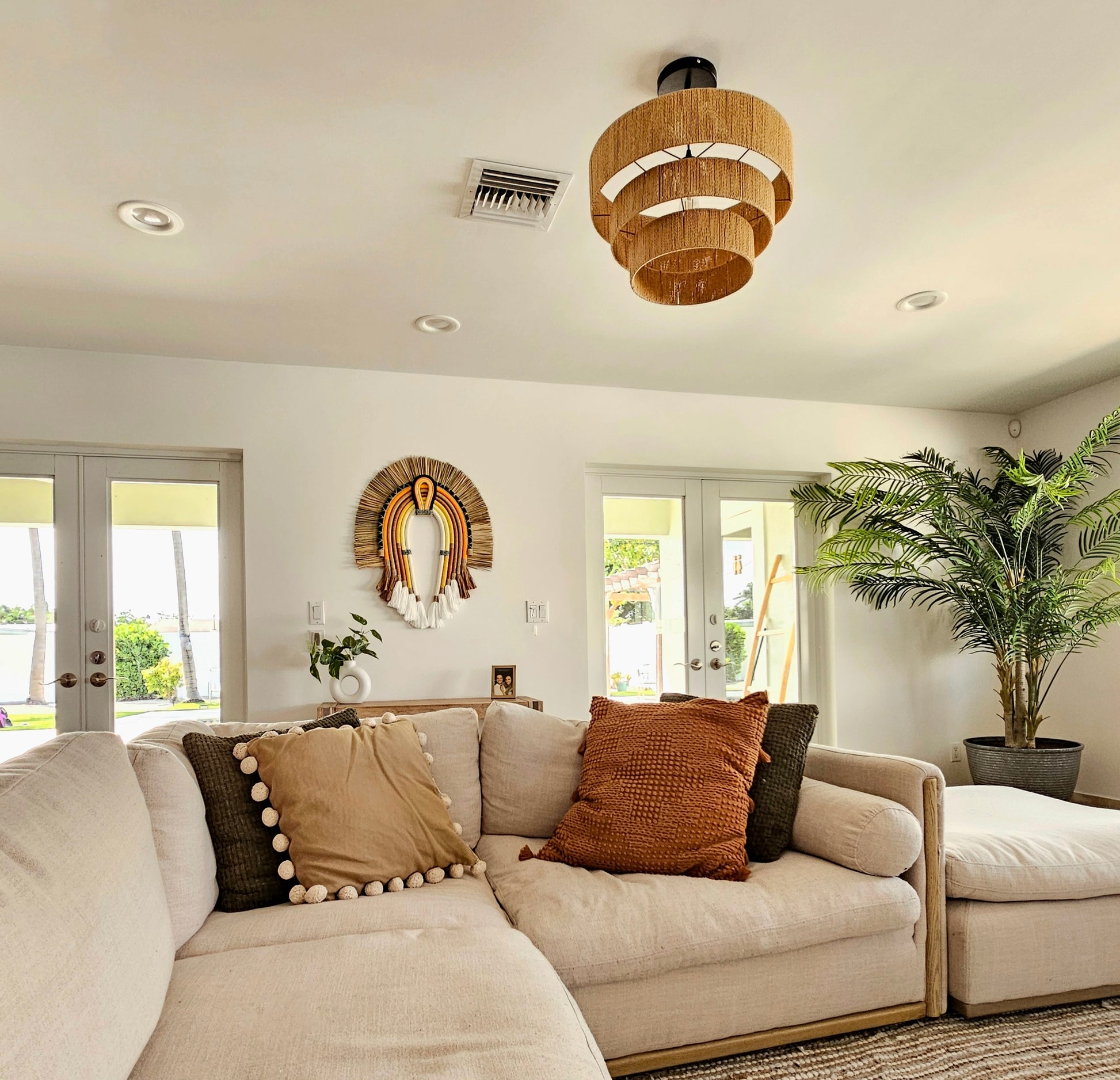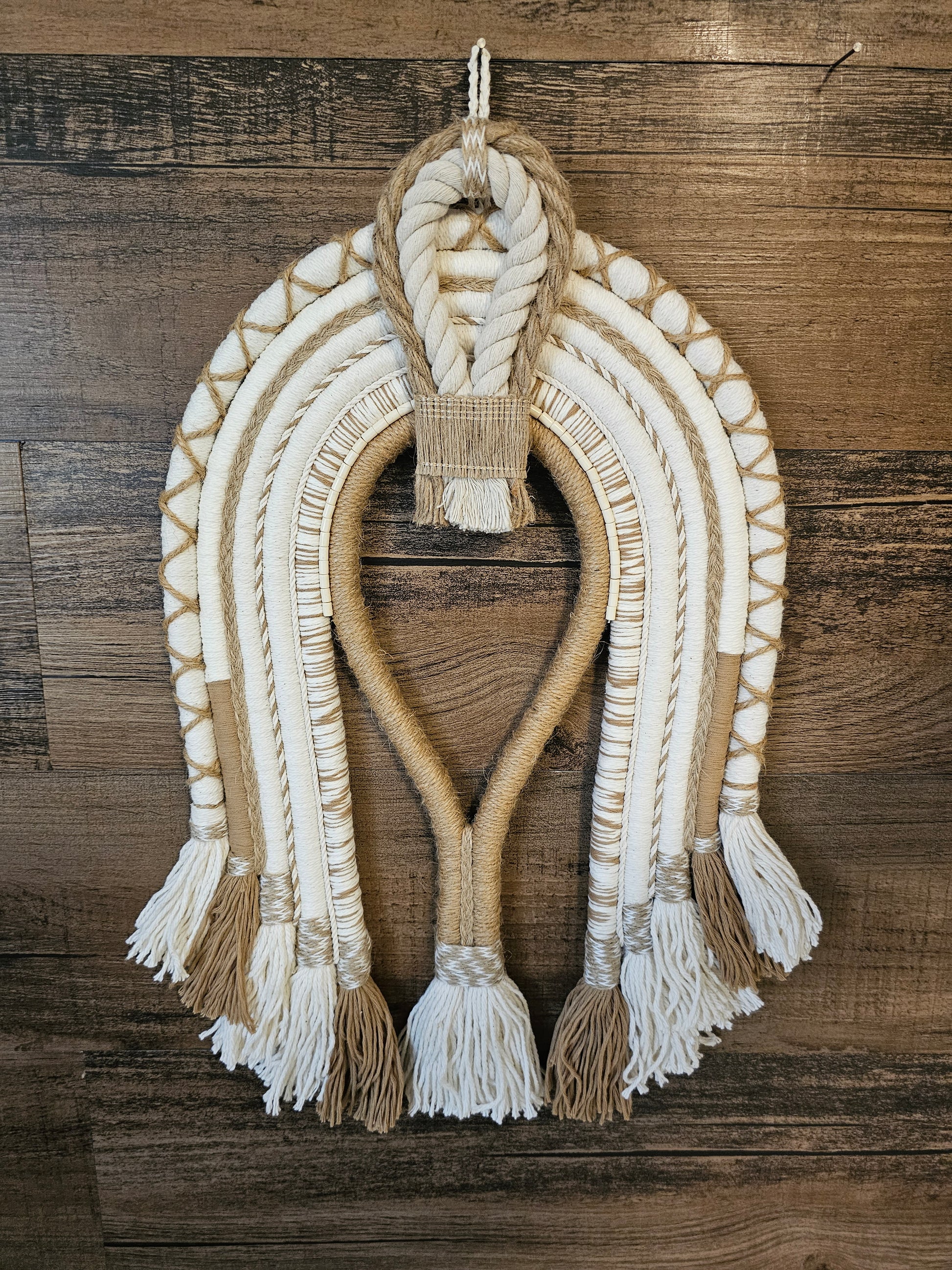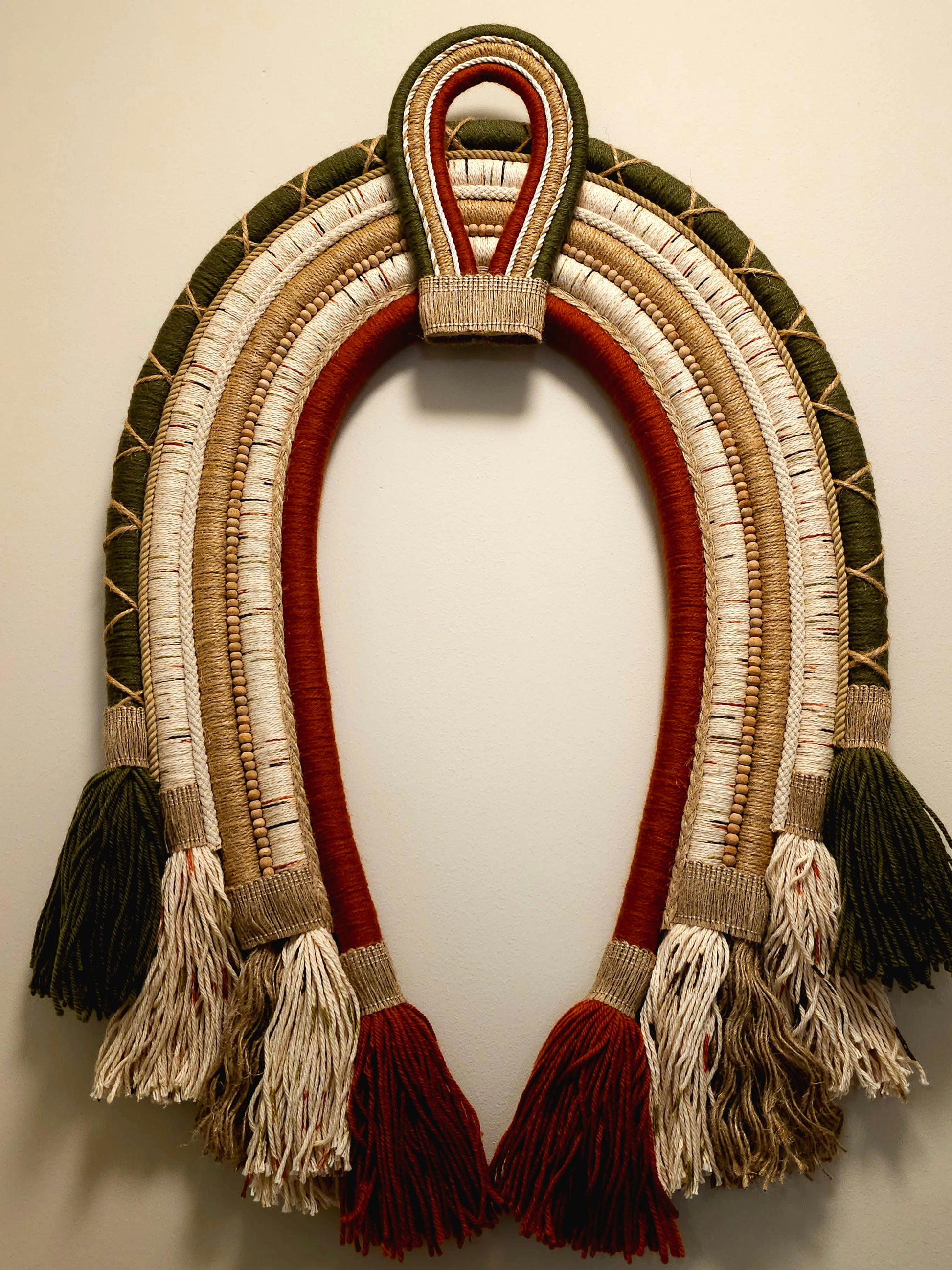 A Textile Cocar is a decorative wall hanging inspired by indigenous headdresses, crafted from woven fibers, fabric, and natural materials. It often features layered arches, intricate patterns, and a mix of textures like raffia, cotton, and wool. With earthy and vibrant hues, it mimics the grandeur of ceremonial feathered headdresses, with bohemian and modern aesthetics.