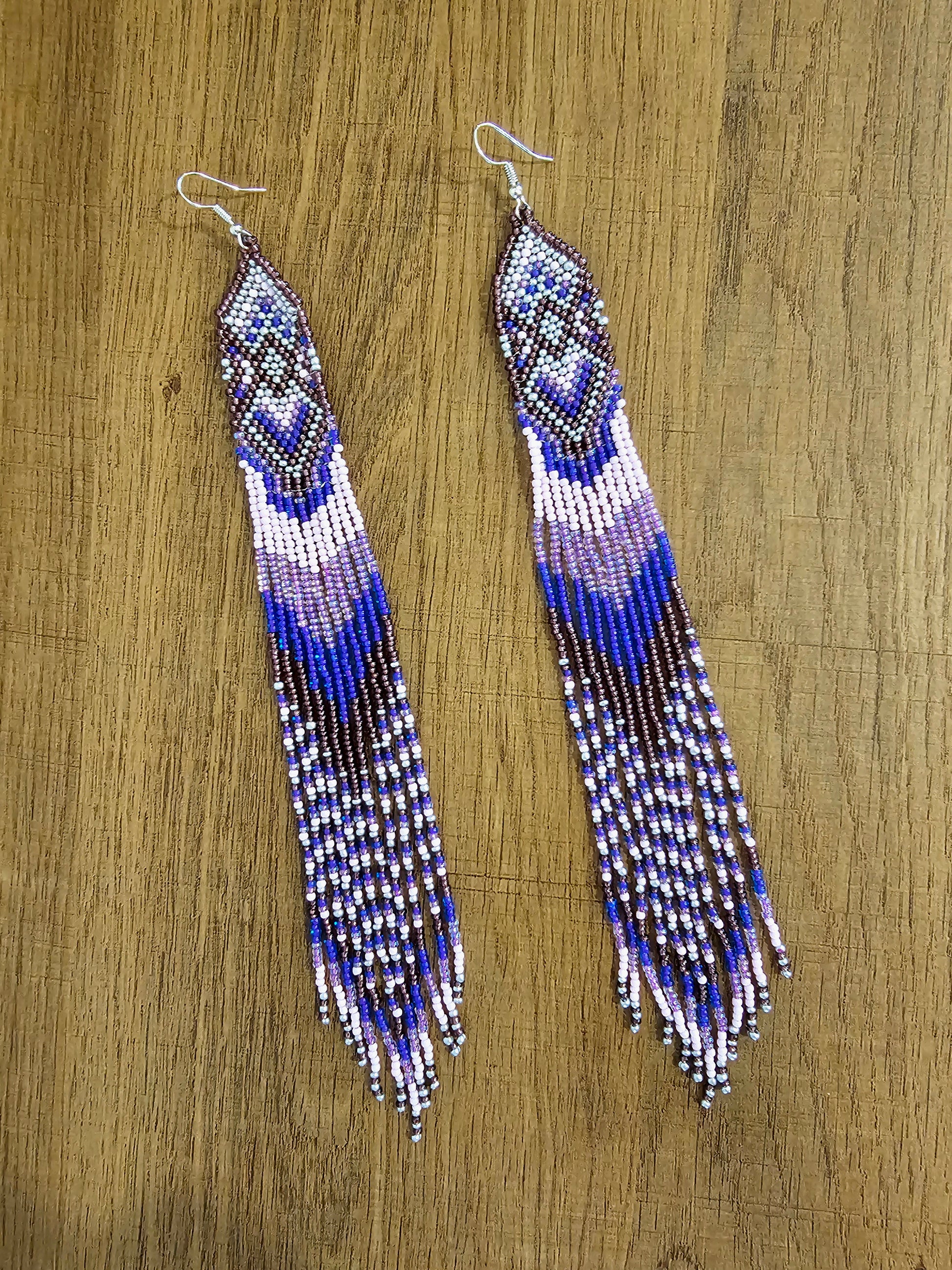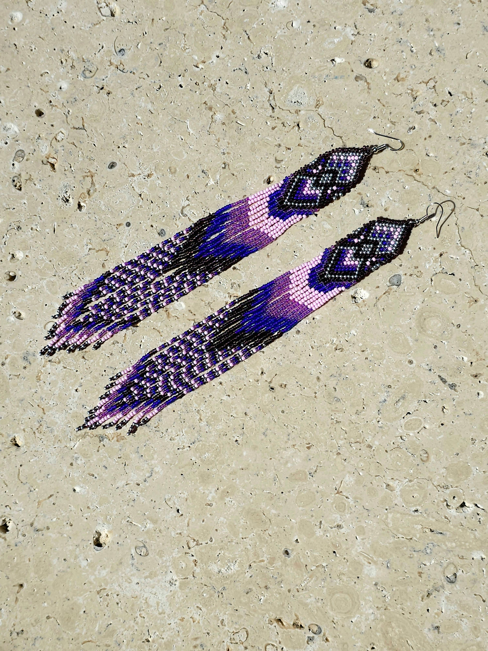 These stunning handcrafted earrings feature a blend of deep violet, soft lavender, and black in a striking geometric design. Their long, flowing fringe adds movement and elegance, perfect for a bold, free-spirited look. Lightweight and eye-catching, they’re a beautiful statement piece for any occasion.