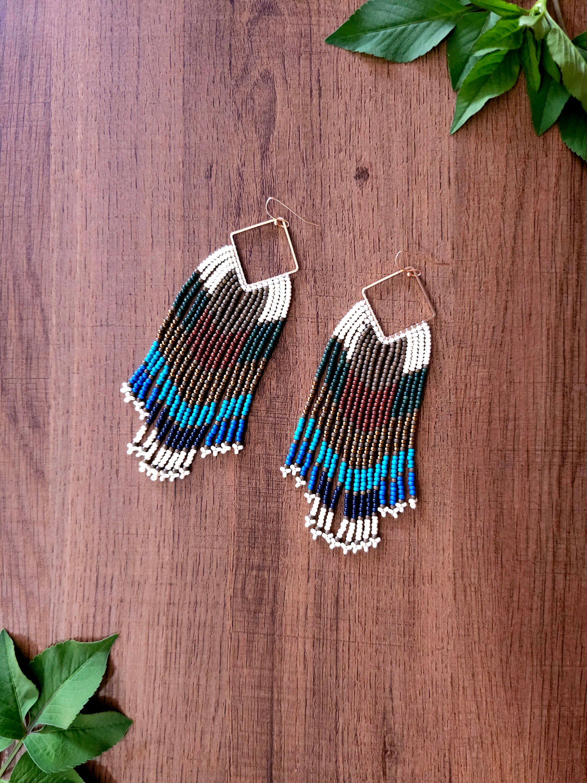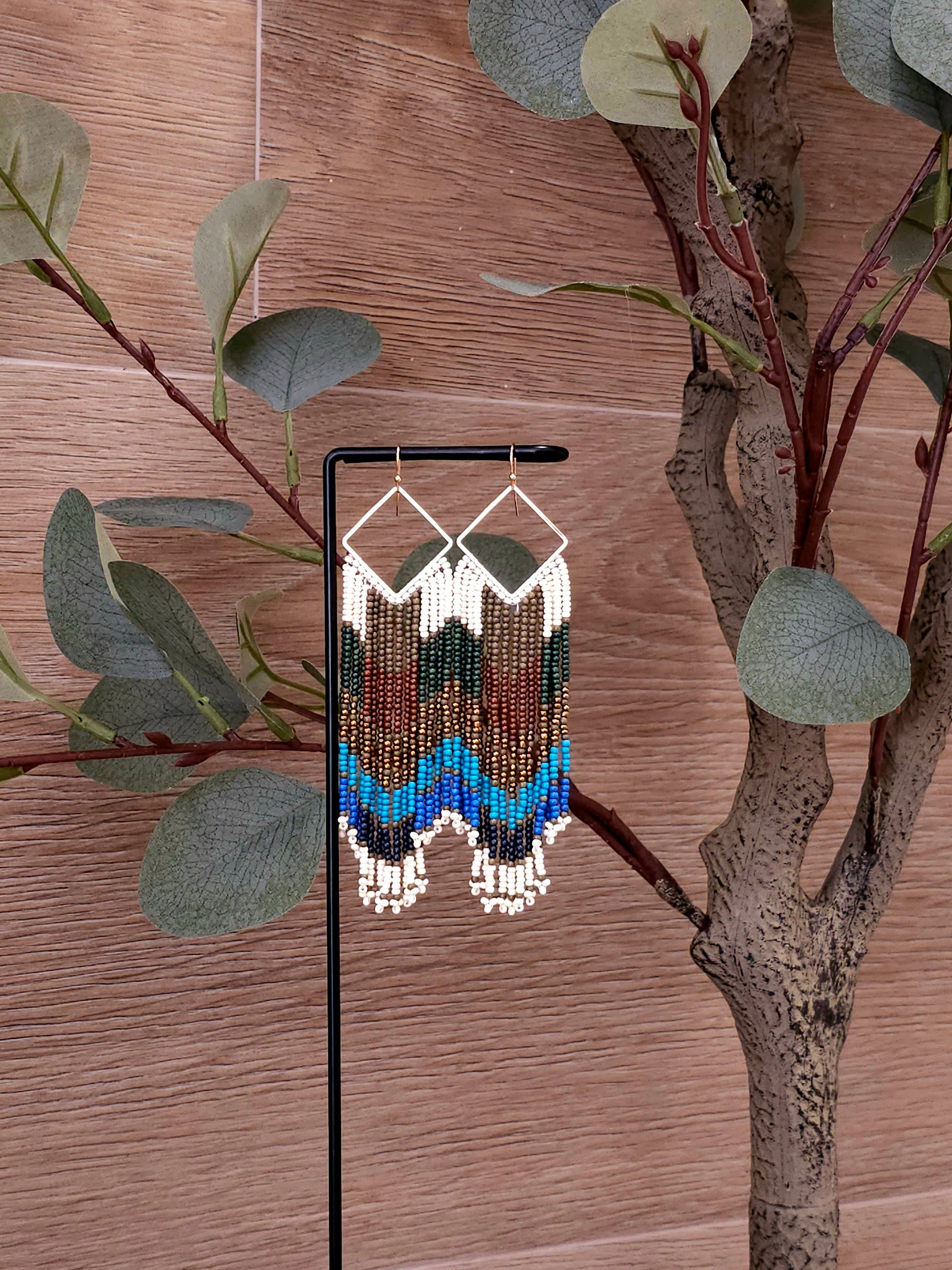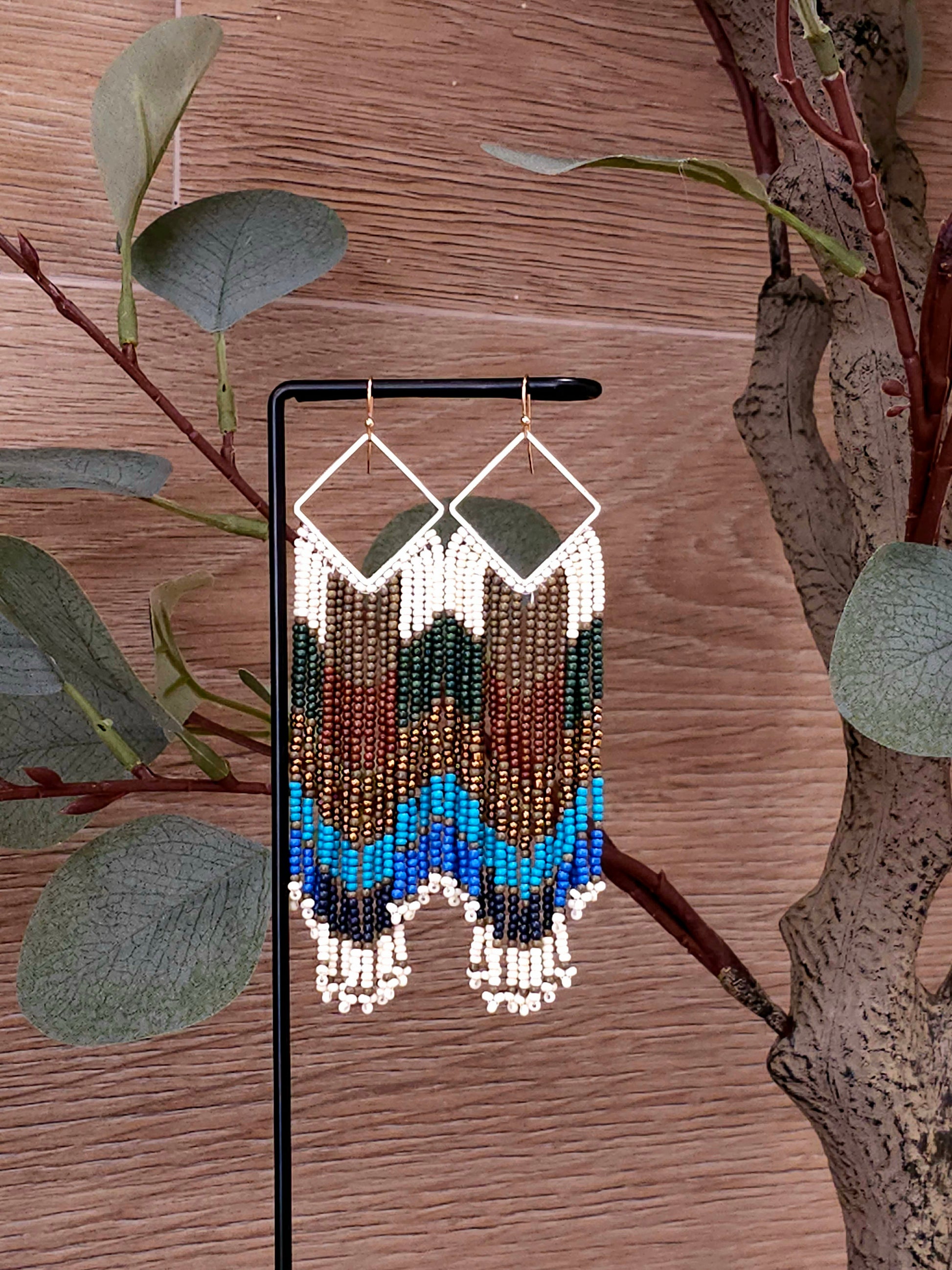 Discover the timeless allure of our "Tribal Elegance" earrings. Handcrafted with meticulous attention to detail, these earrings feature an earthy color palette of brown, white, black, and shades of blue beads. The intricate beading forms a beautiful cascading pattern, elegantly framed by gold diamond-shaped outlines. These earrings are perfect for adding a touch of natural beauty and cultural sophistication to any outfit.